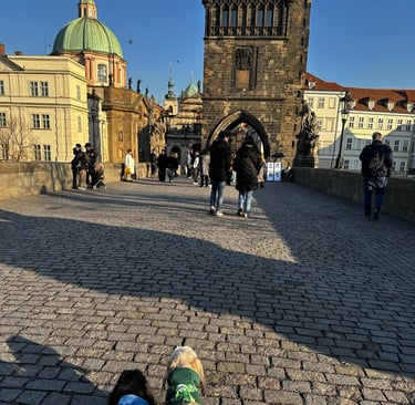 Most Karola to obowiązkowy punkt każdej wizyty w Pradze. Jednak tłumy turystów mogą być przytłaczające, zwłaszcza dla małych psów. Najlepszym rozwiązaniem jest spacer wcześnie rano, gdy most jest jeszcze spokojny i można podziwiać jego piękno bez pośpiechu. Nasze psy na pewno przyciągały spojrzenia przechodniów więc potrzeba trochę asertywności bo są prośby o głaskanie ;)